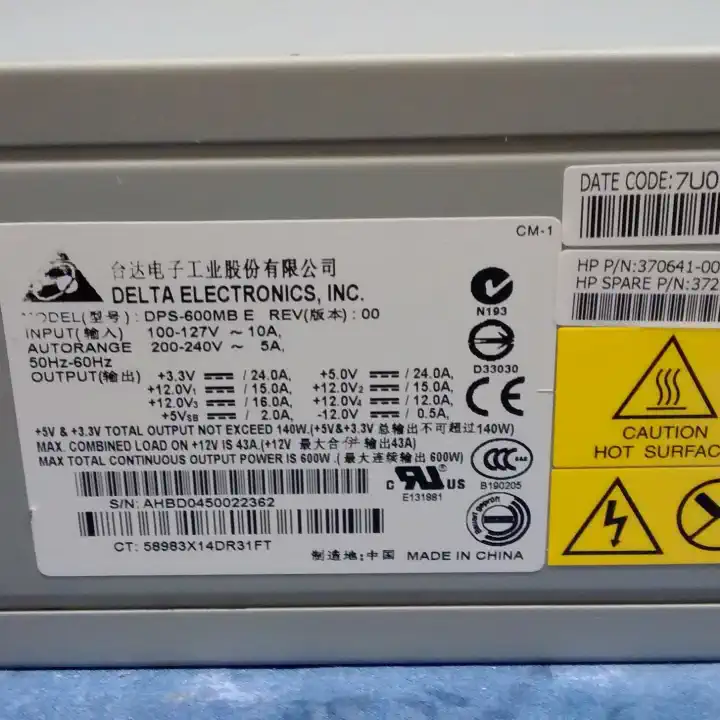 370641-001, Delta, HP ProLiant ML150 G2 600W PSU, 100-127V / 200-240V AC In & Fan on Back Of Case, 2×12-pin, 2×4-pin, 2×3-pin, +3.3V & +5V Combined 140W Max, +12V 43A Max, +3.3V 24A, +5V 24A, +12.0V1 15A, +12.0V2 15A, +12.0V3 16A, +12.0V4 12A, -12.0V 0.5A, +5Vsb 2A, Refurb, 120 Days Warranty, SRP £call In Stock!