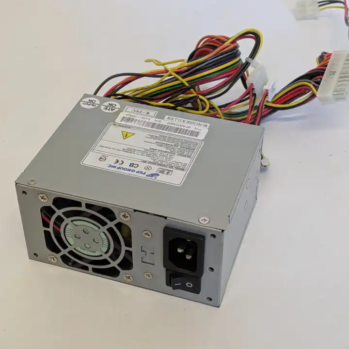 FSP200-50SNV (PF), P/N 9PA2003200, DIGN HV5, Viglen Contender FSP 200W SFX 12V Passive PFC PSU, 230V AC In, Rocker Switch & 6cm Noise Killer Fan on Back of Case, 2×10-pin P1 & 2×2-pin P4 on 32cm Cables, 2 HD/CD on 31cm Cables, 1 HD/CD & 1 FD on 31cm Cables, Power Cables on the LONG Sides, +3.3V & +5V Combined 118W Max, +3.3V 11.5/16.7A, +5V 16/12.6A, +12V 10A, +5Vsb 2A, -12V 0.5A, 125mm W x 63.5mm H x 100mm D, SRP £call In Stock!