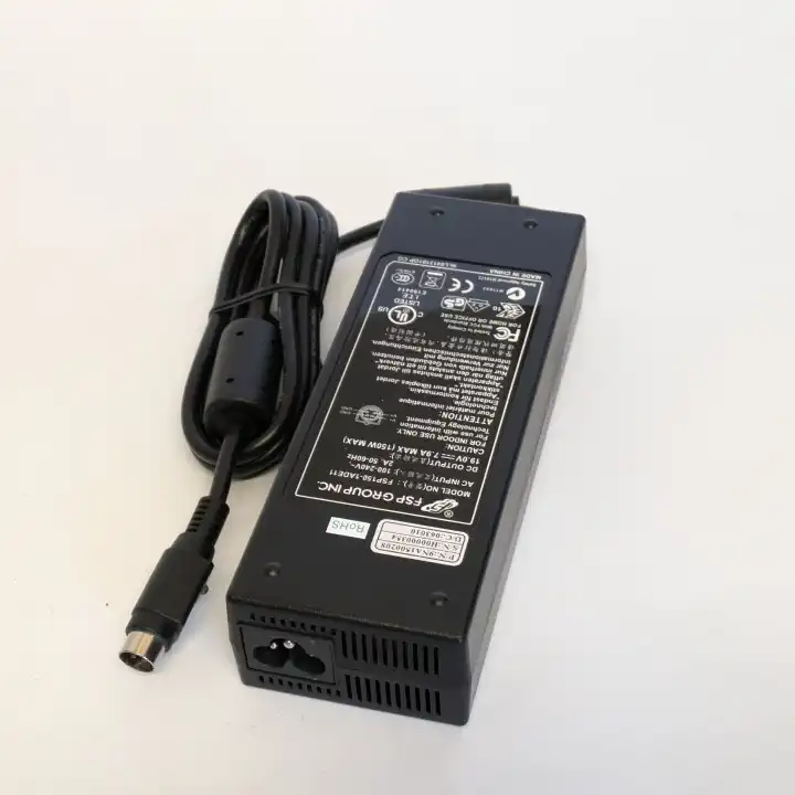 FSP150-1ADE11 (F042), 9NA1500208, FSP 150W AC Adapter, 4-pin mini-DIN, 2 V+ Terminals on the Left & Ground Pins on Right when looking at the Pins with Connector Flat Edge Uppermost, 4 Pins in Trapezoid Configuration with Upper Pins 3mm Apart & Lower Pins 4mm Apart, Green LED, Ferrite Ring, 100-240V AC, IEC320 C6, 30mm Fan, SRP £call In Stock!